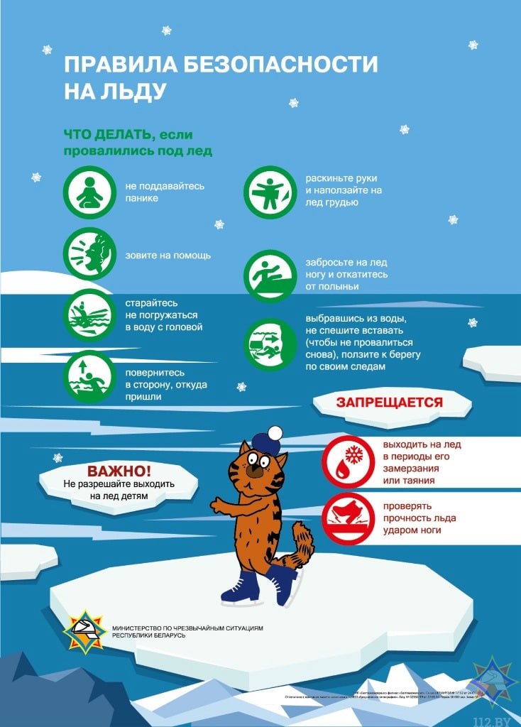 Перед тем как ступить на лёд, убедитесь в его надёжности. Запрещается выход на лёд во время ледостава, пока толщина льда не достигнет 7 см.