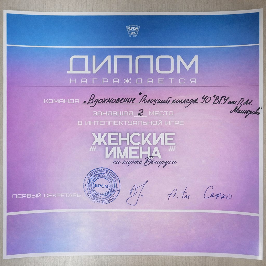Команда «Вдохновение» (военно-патриотический клуб «Патриот», руководитель Осипов А.Г.) заняла 2 МЕСТО в интеллектуальной игре «Женские имена на карте Беларуси»!